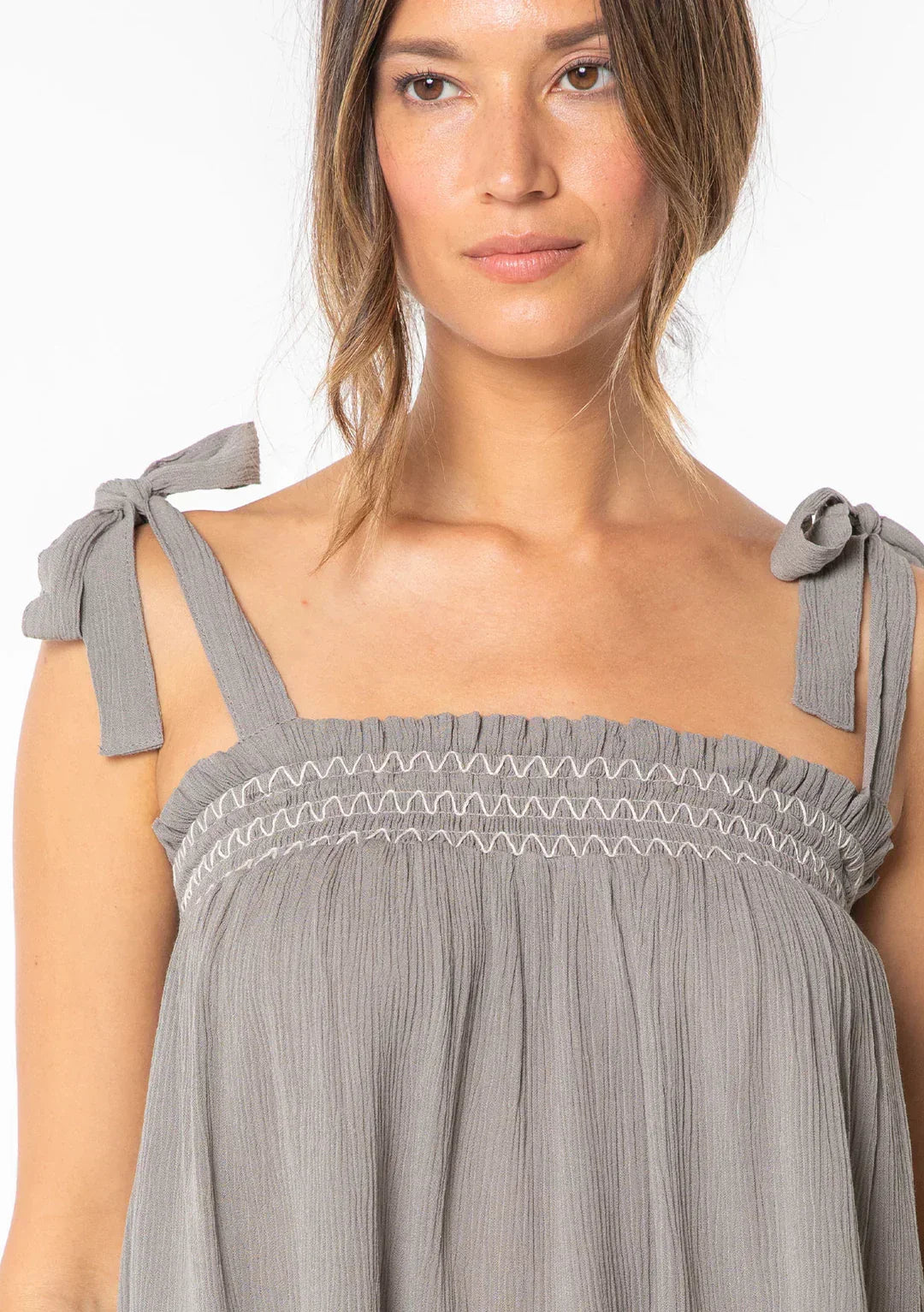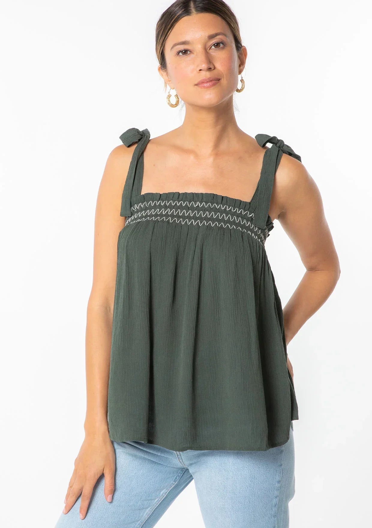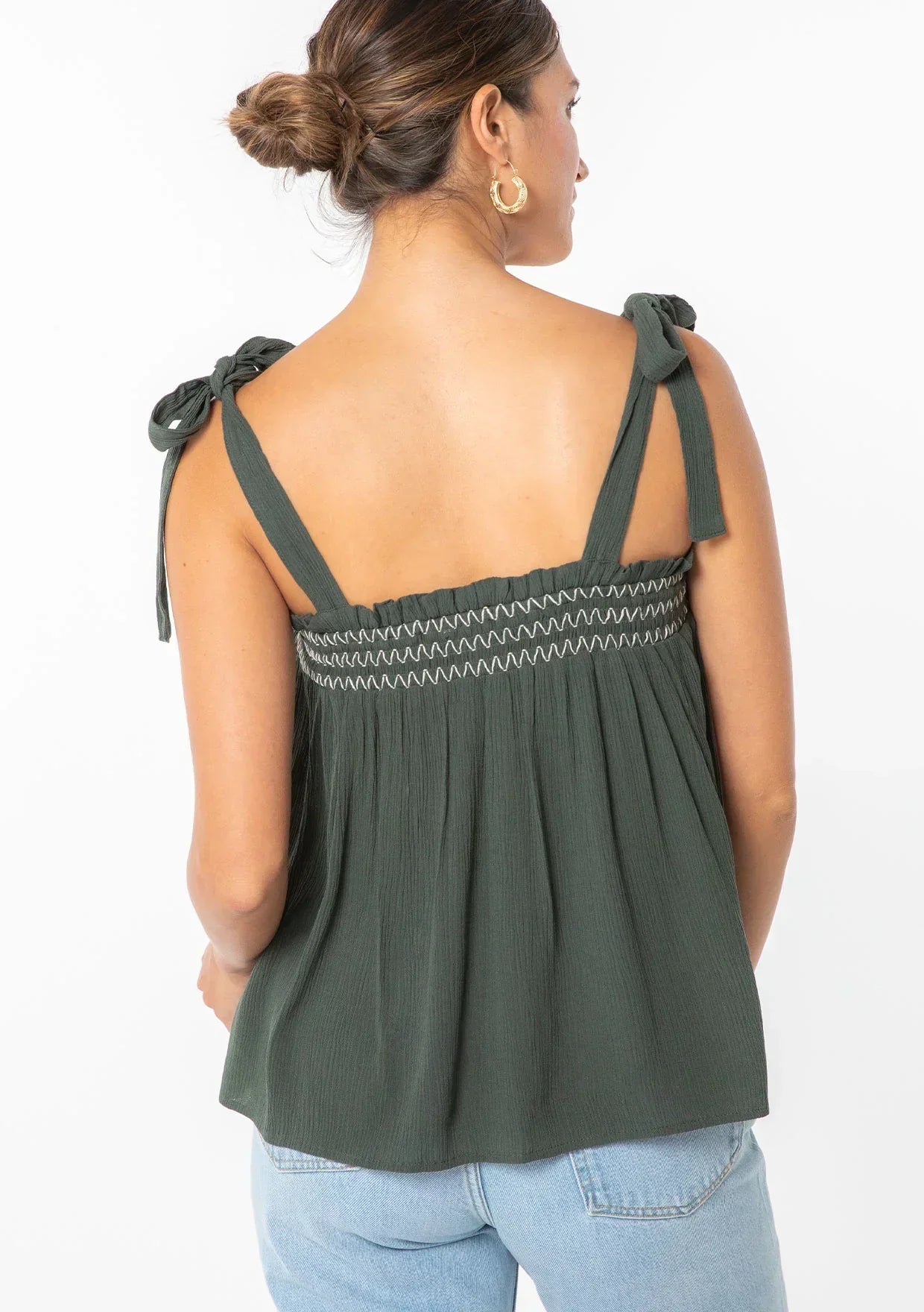Step into the season with confidence and charm—grab your Bohemian Tie Shoulder Smocked Tank Top today!