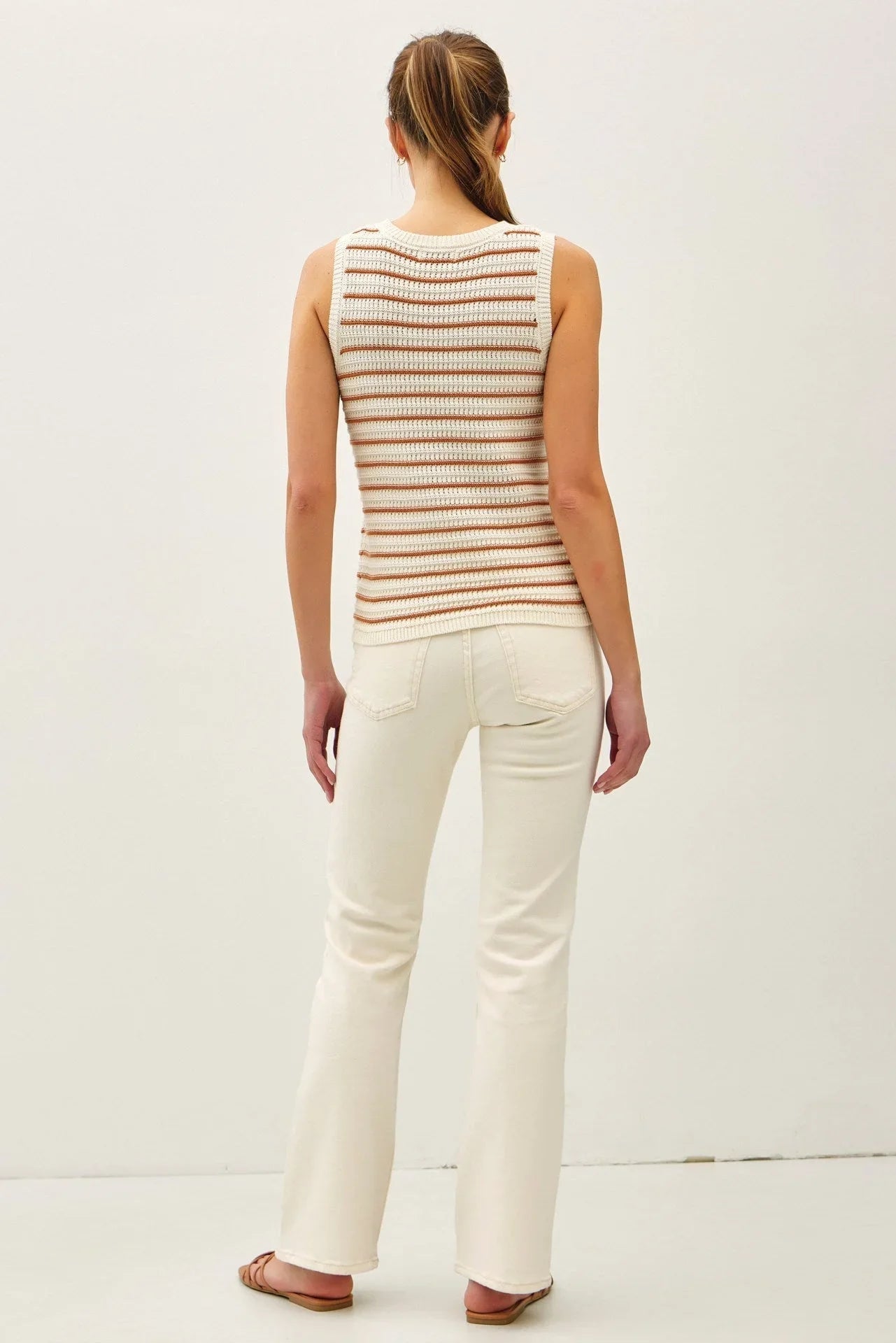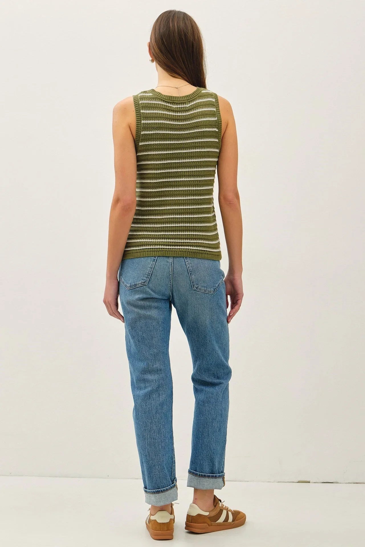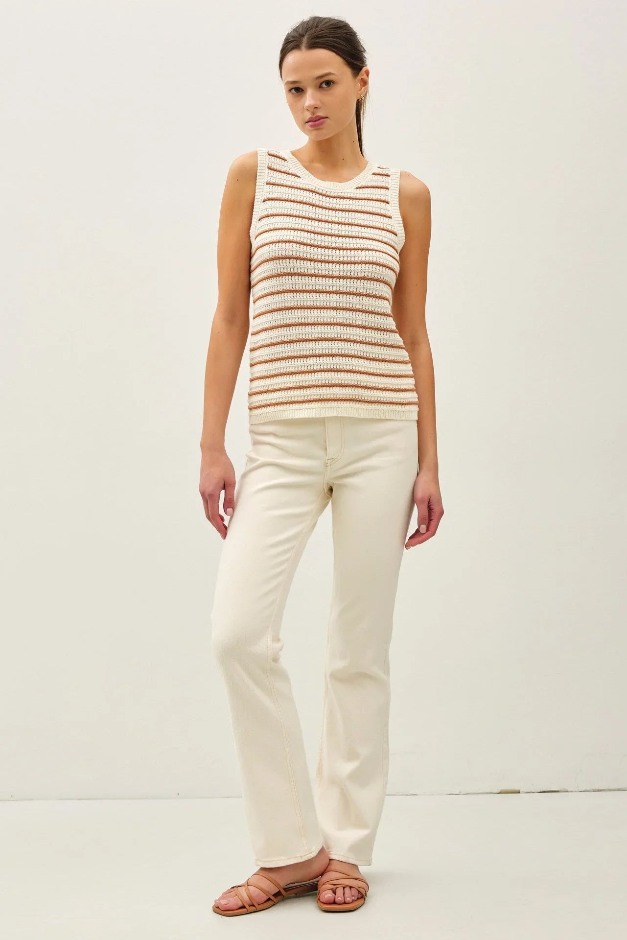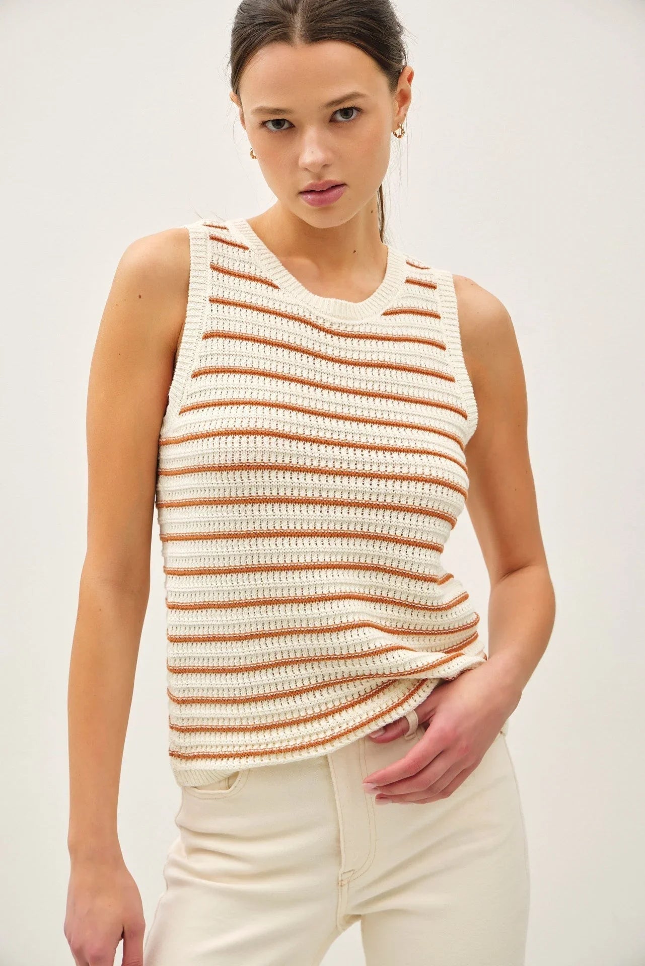 This chunky knit striped sweater tank combines style and comfort. Crafted from 100% cotton, it features a round neck and ribbed details for a polished look. The sleeveless design and striped pattern make it versatile for layering or wearing alone. Perfect for casual outings or relaxed evenings, this knit striped sweater tank is a wardrobe essential.