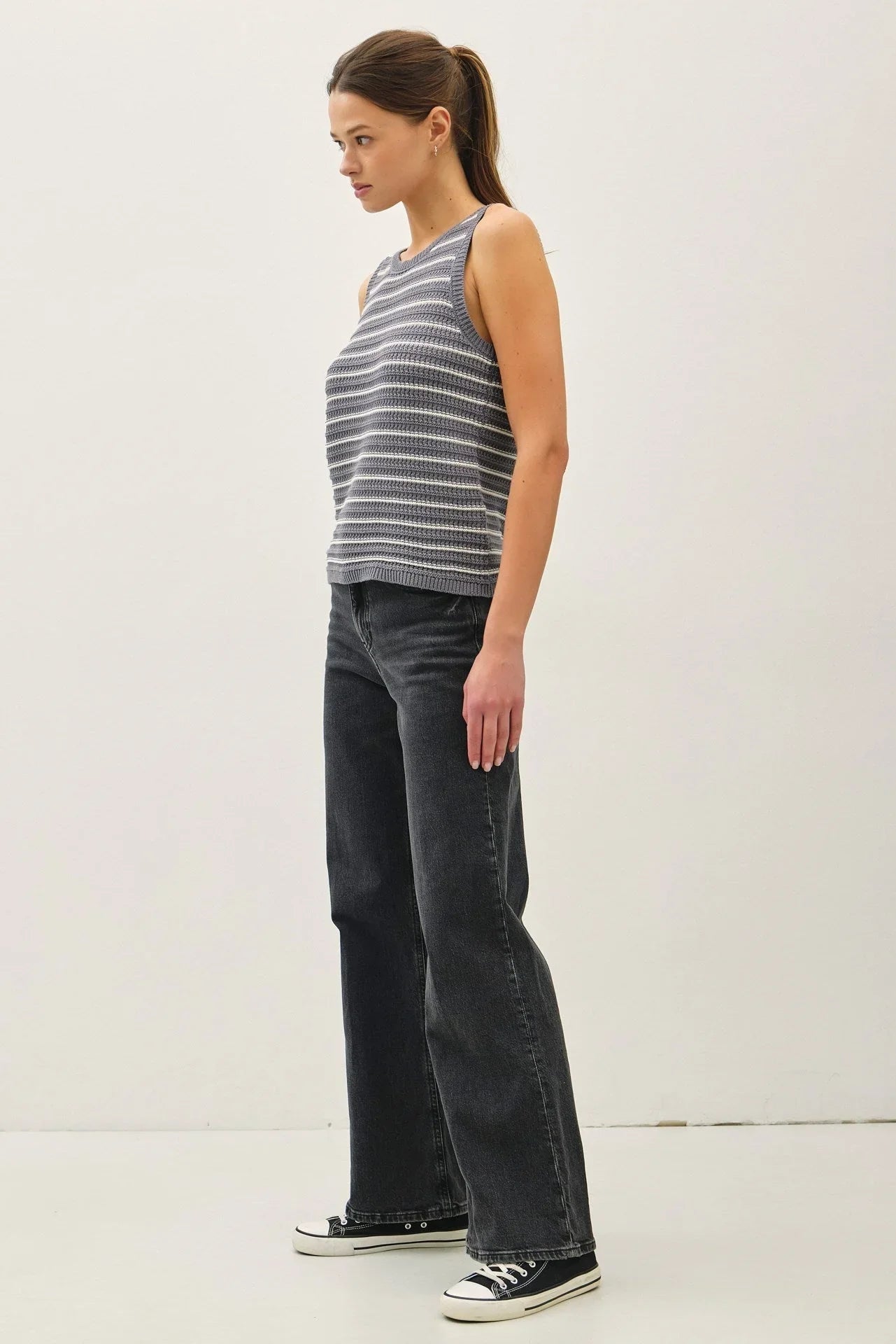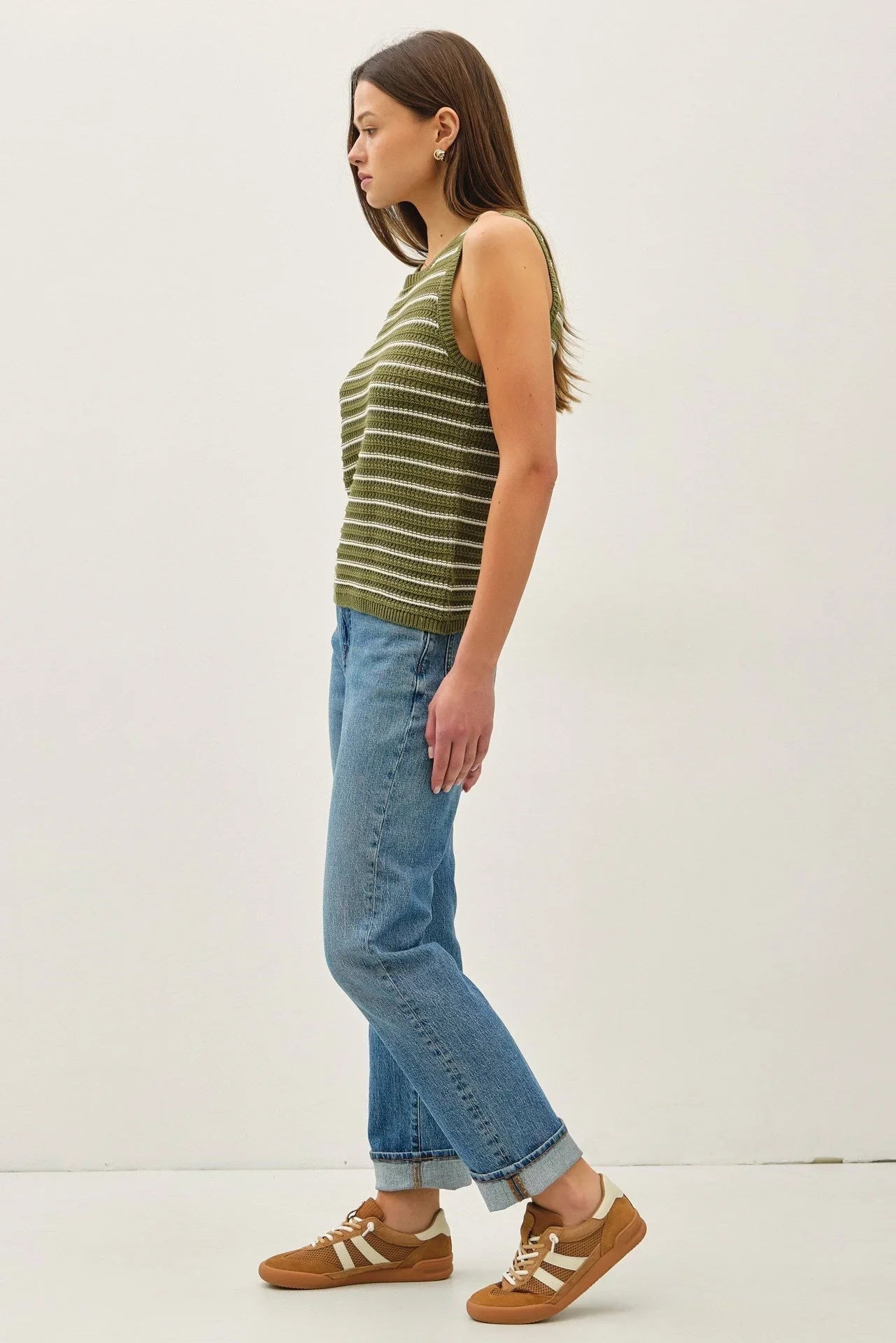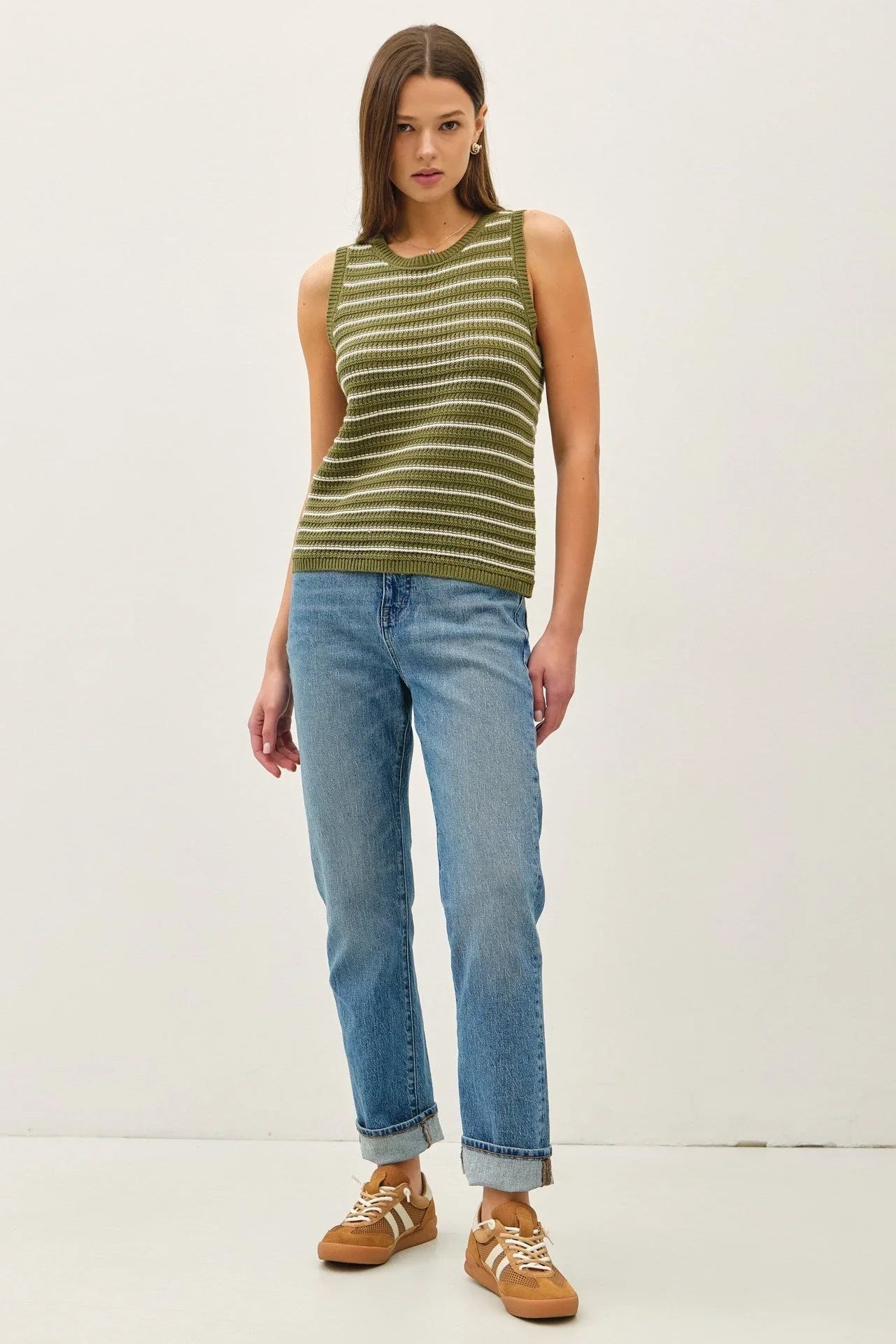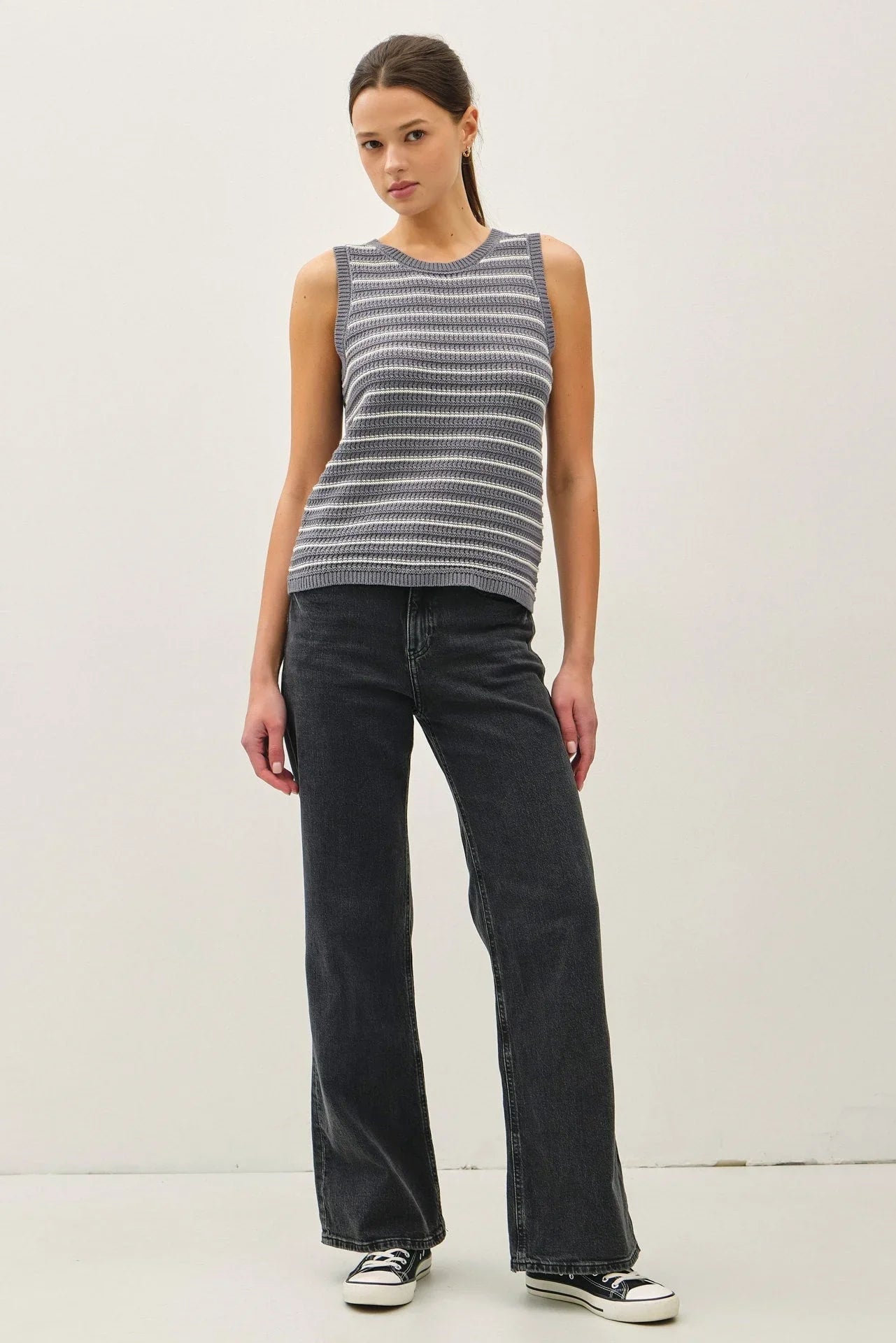 This chunky knit striped sweater tank combines style and comfort. Crafted from 100% cotton, it features a round neck and ribbed details for a polished look. The sleeveless design and striped pattern make it versatile for layering or wearing alone. Perfect for casual outings or relaxed evenings, this knit striped sweater tank is a wardrobe essential.