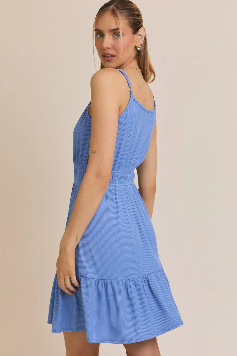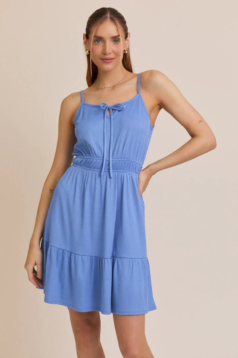 Elevate your summer wardrobe with this charming blue knit mini dress from Daisy Lane. The front tie bow strap design adds a touch of elegance and femininity. Perfect for warm weather occasions, this dress combines style and comfort. The versatile bow strap mini dress is an essential addition to any fashion-forward closet.