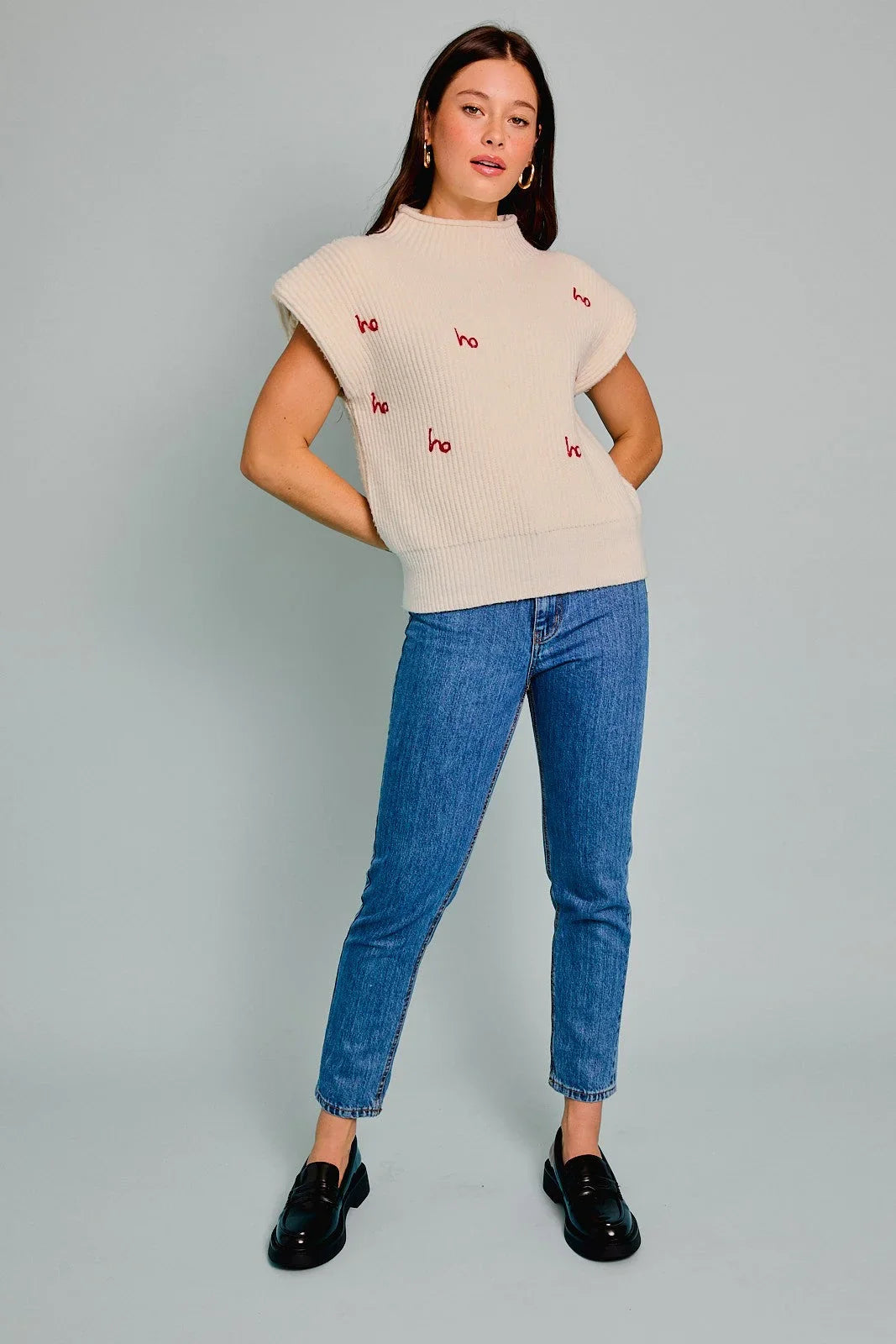 Get festive in style with the MOCK NECK POWER SHOULDER 'HO HO HO' SWEATER TOP, the ultimate holiday wardrobe essential. Featuring a chic mock neck design and bold power shoulders, this sweater top effortlessly combines comfort and sophistication. The playful "Ho Ho Ho" embroidery adds a cheerful touch, making it perfect for Christmas gatherings, cozy nights, or winter outings.