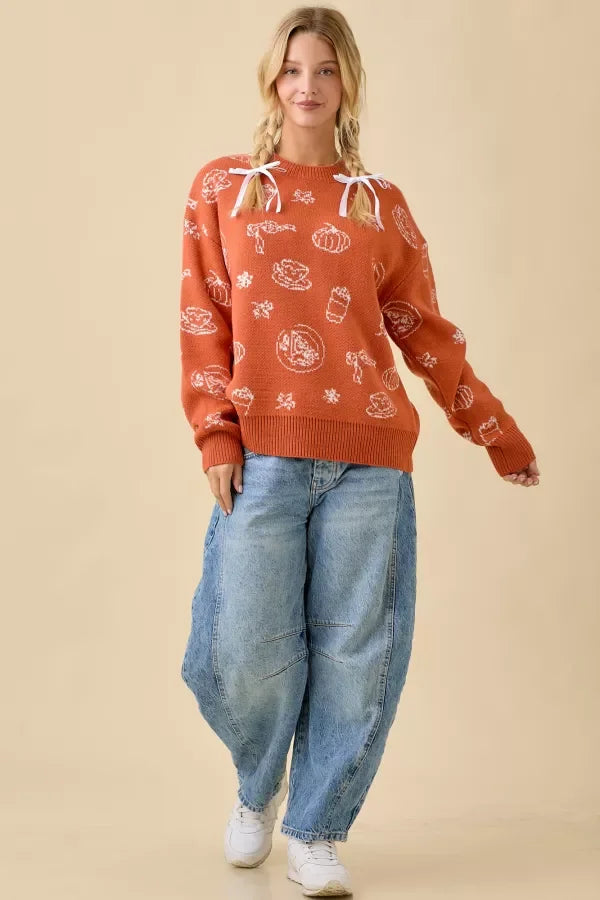 The delicate ribbon detail at the shoulders adds a feminine flair, while the relaxed, slightly oversized fit ensures comfort for all-day wear. Whether you're sipping pumpkin lattes, enjoying Thanksgiving dinner, or posing for festive holiday photos, this versatile sweater pairs beautifully with jeans, skirts, or leggings for a look that's both stylish and cozy.