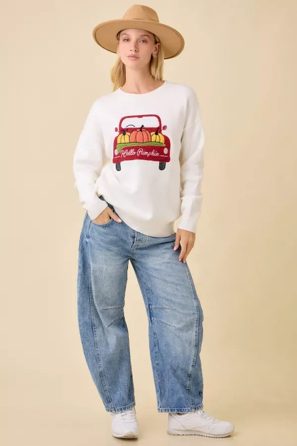 Celebrate cozy autumn vibes with the Pumpkin Truck Embroidered Patchwork Sweater—a charming, handcrafted knit top that blends comfort with seasonal flair. Featuring intricate embroidery of a nostalgic pumpkin truck scene and artistic patchwork detailing, this sweater is perfect for those who adore unique, statement-making apparel.