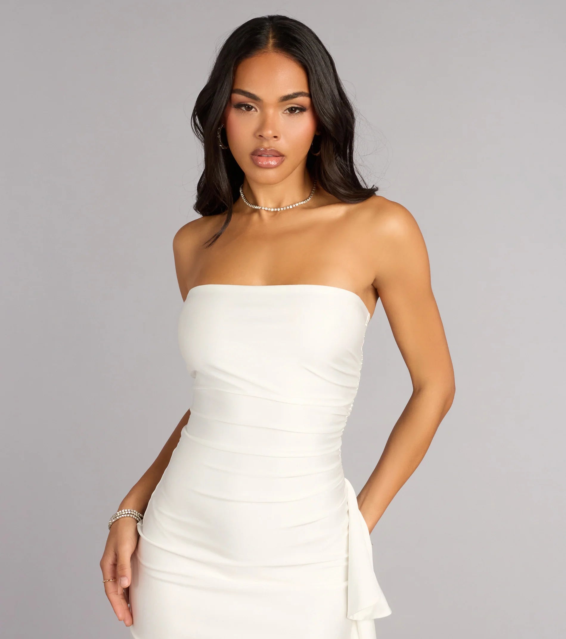 For when sleek just isn’t enough. This strapless bodycon mini dress keeps it polished in the front and playful on the side with a cascading ruffle detail, perfect for date nights and GNOs!