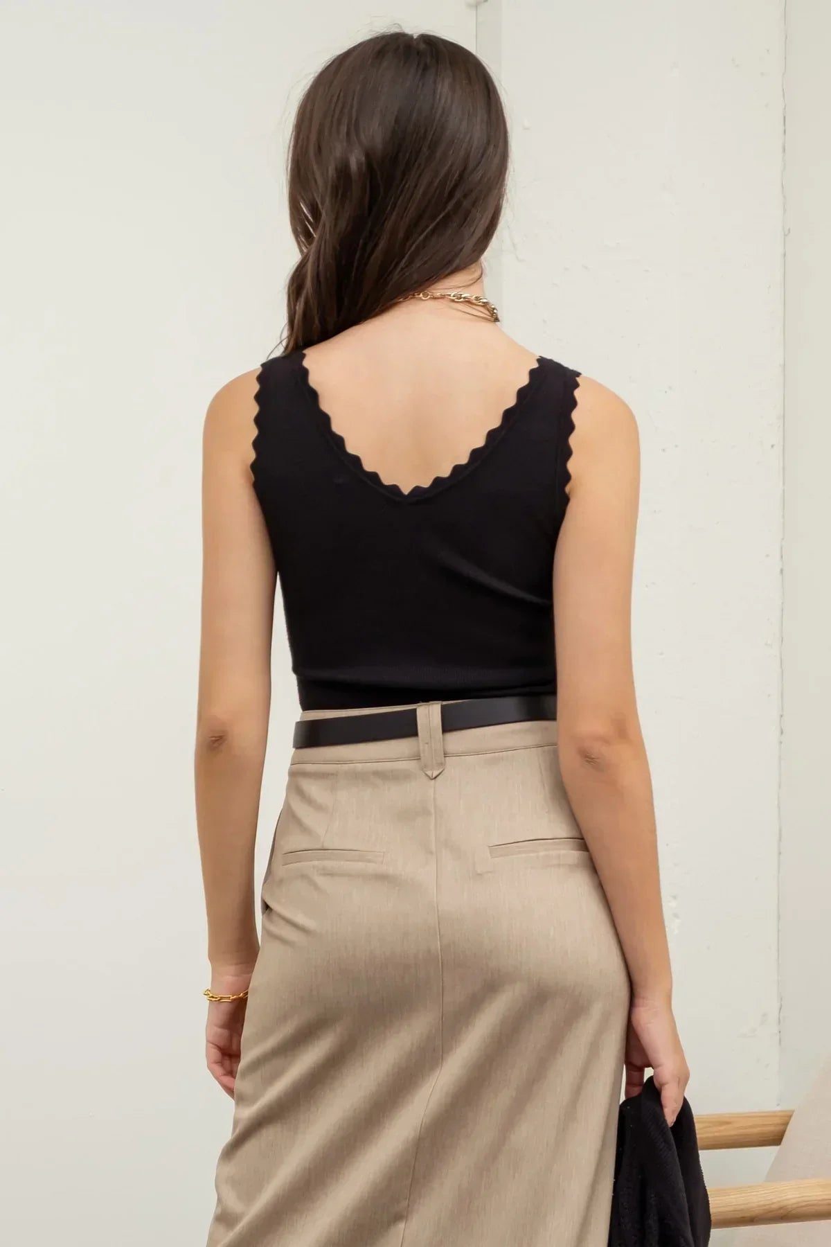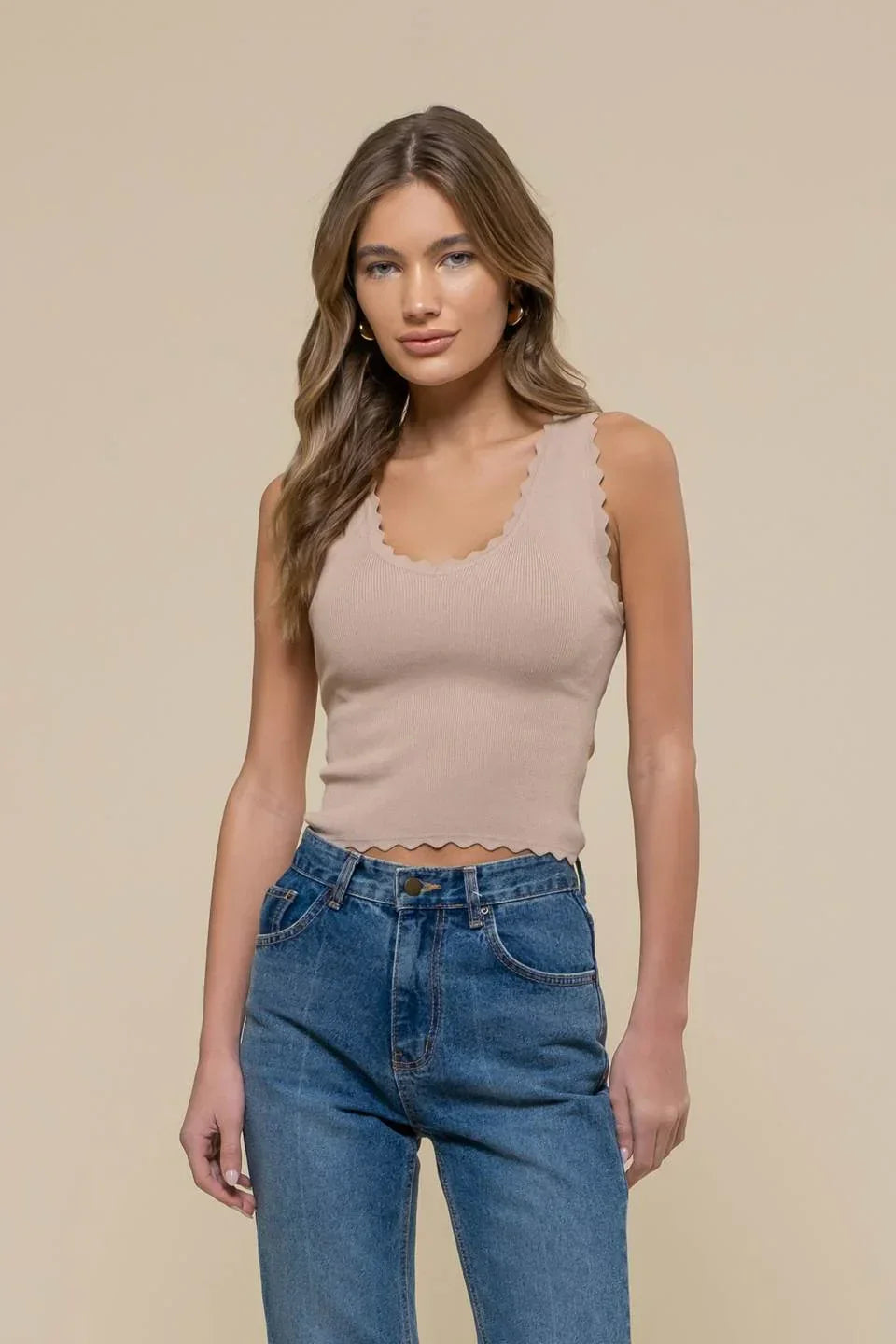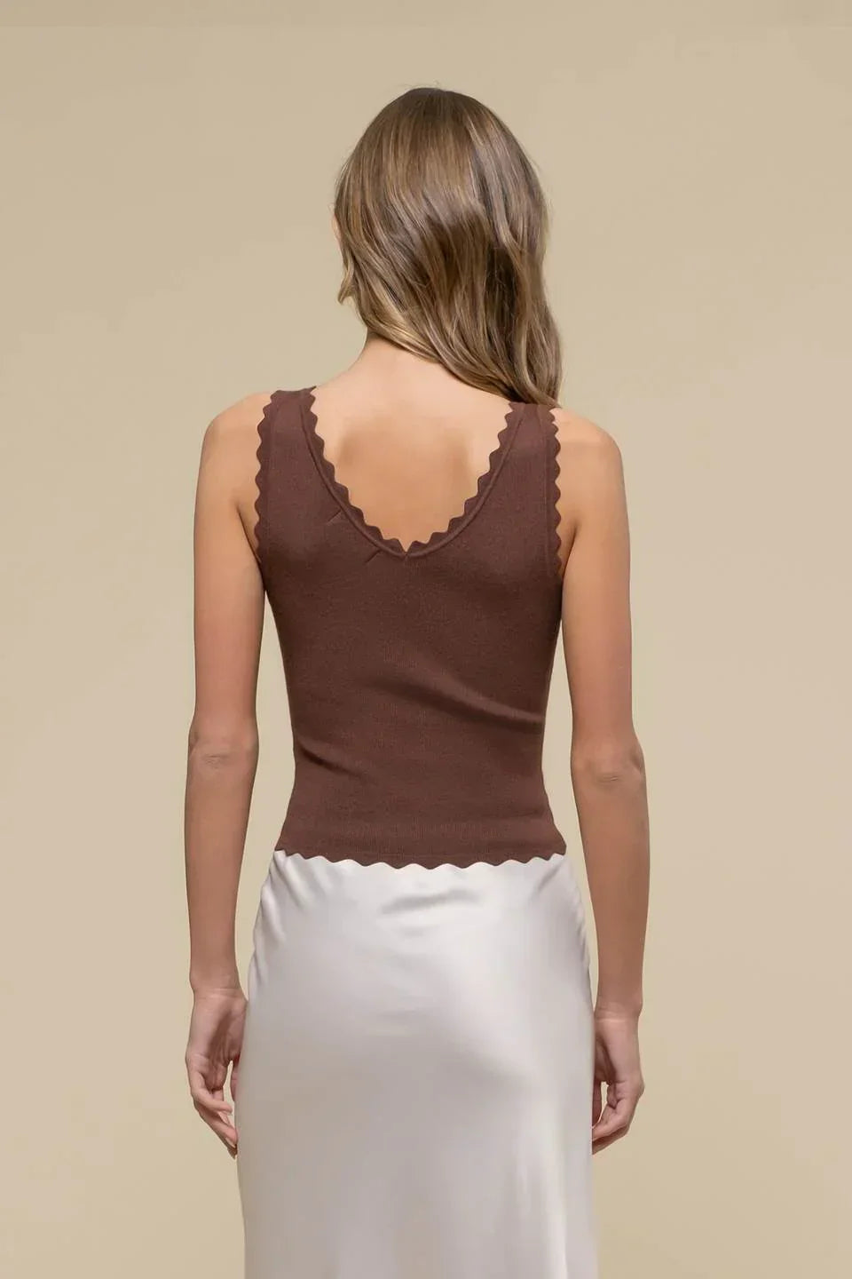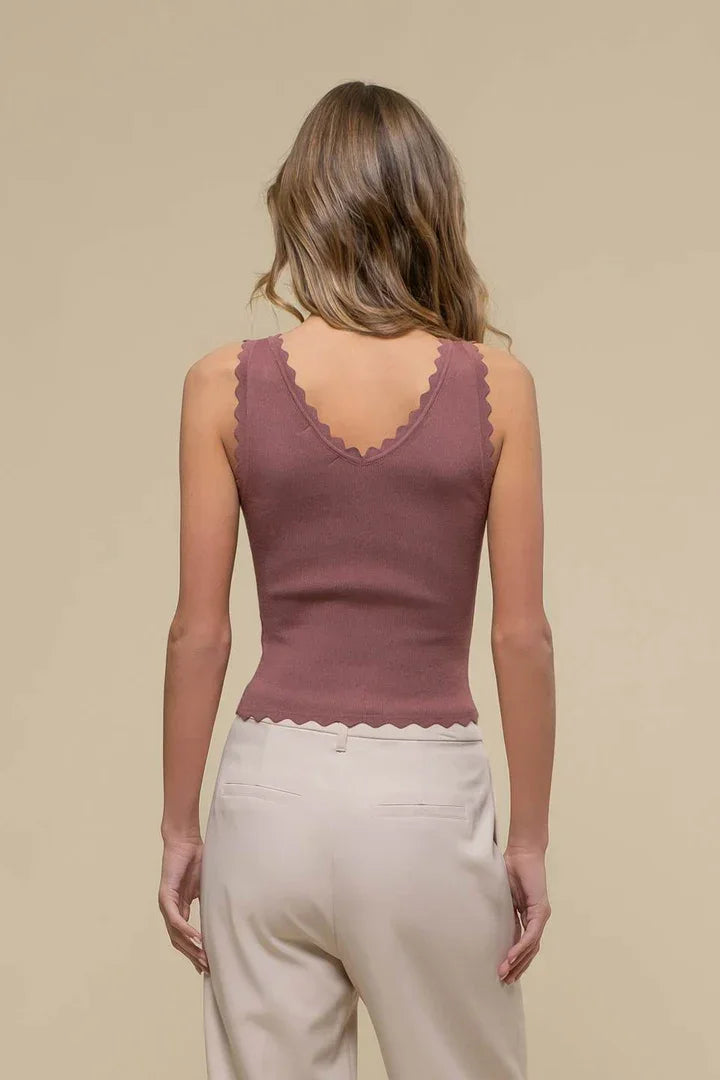 This stylish Scallop Edge Sleeveless Knit Top boasts a V neckline and scalloped edge knit, perfect for a trendy and chic look. The sleeveless design adds a touch of versatility, while the knit material provides comfort and style. This top is perfect for any occasion and pairs well with any outfit. A must-have addition to your wardrobe!