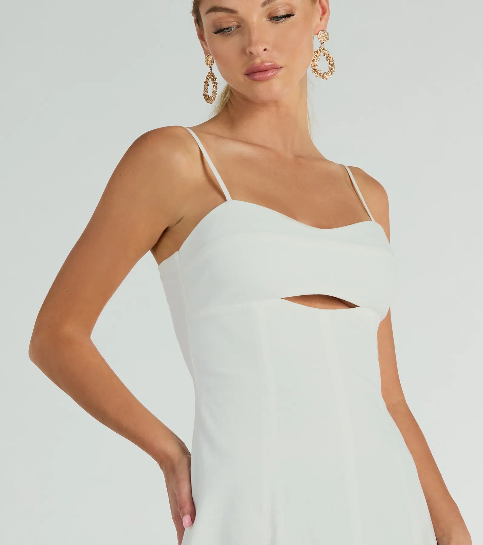 Create a sensational look in this effortlessly chic midi dress on your next weekend getaway. The small cutout below the bust adds a touch of allure to the flowy A-line silhouette.