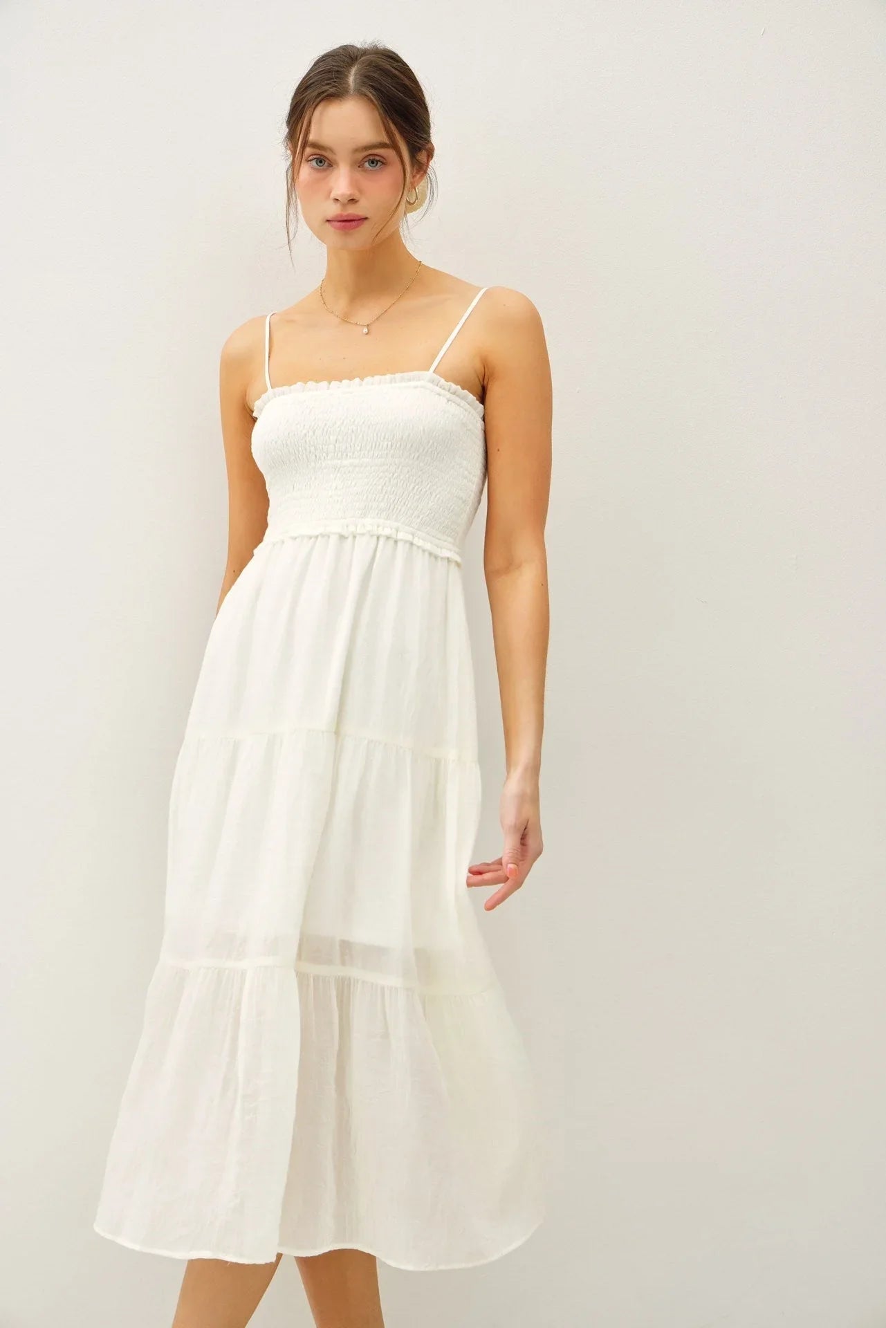 Make every moment unforgettable in the Sheer Smocked Bodice Midi Dress — a must-have addition to your summer wardrobe.
