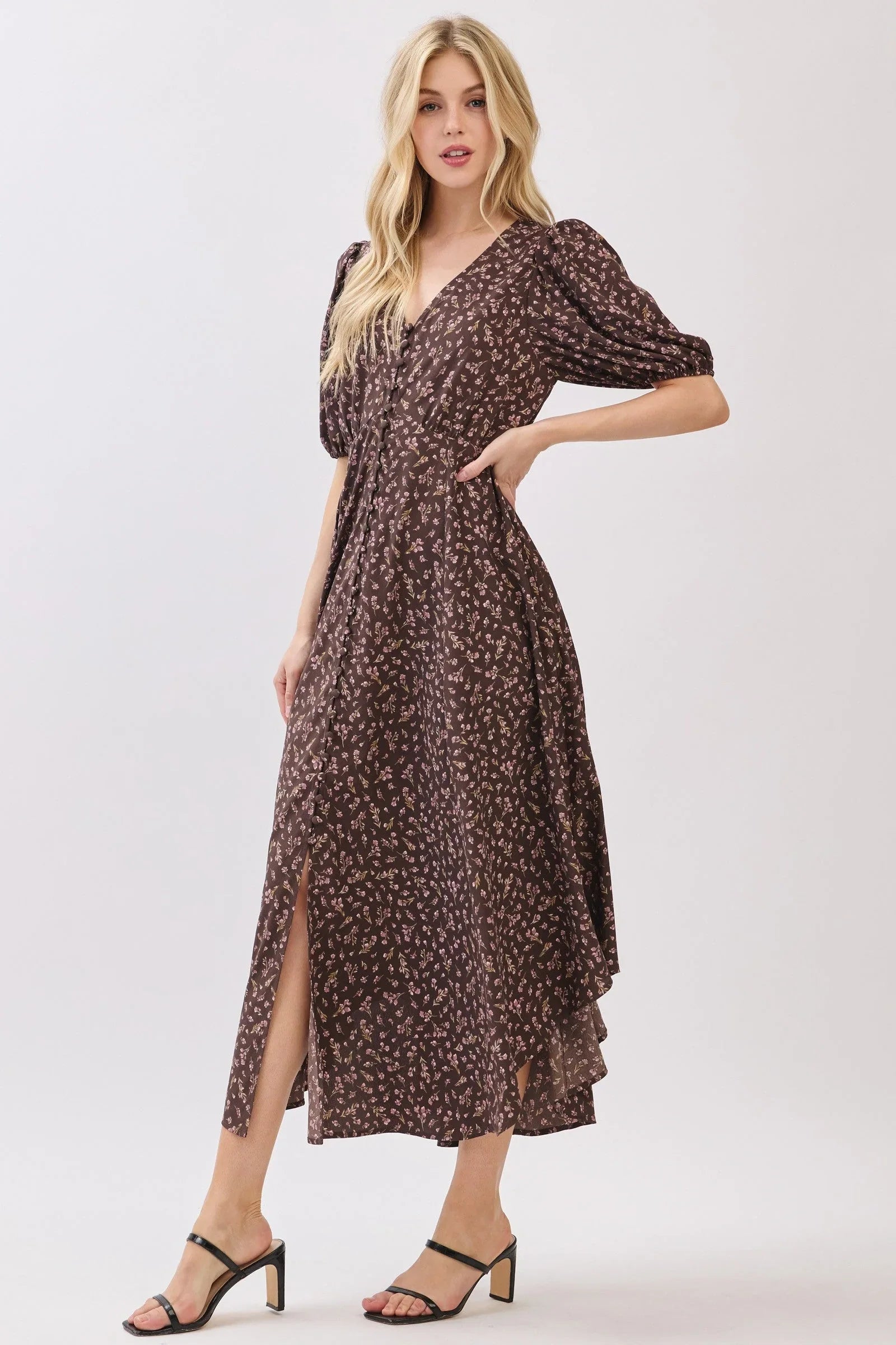 Crafted from lightweight offers a contemporary fit that flatters your silhouette while keeping you comfortable. The enchanting floral pattern and flowing maxi-length skirt exude pre-fall charm, while the short sleeves and V-neckline add a touch of sophistication. The delicate self-covered button details create a subtle yet eye-catching accent, making this piece a timeless addition to your wardrobe.