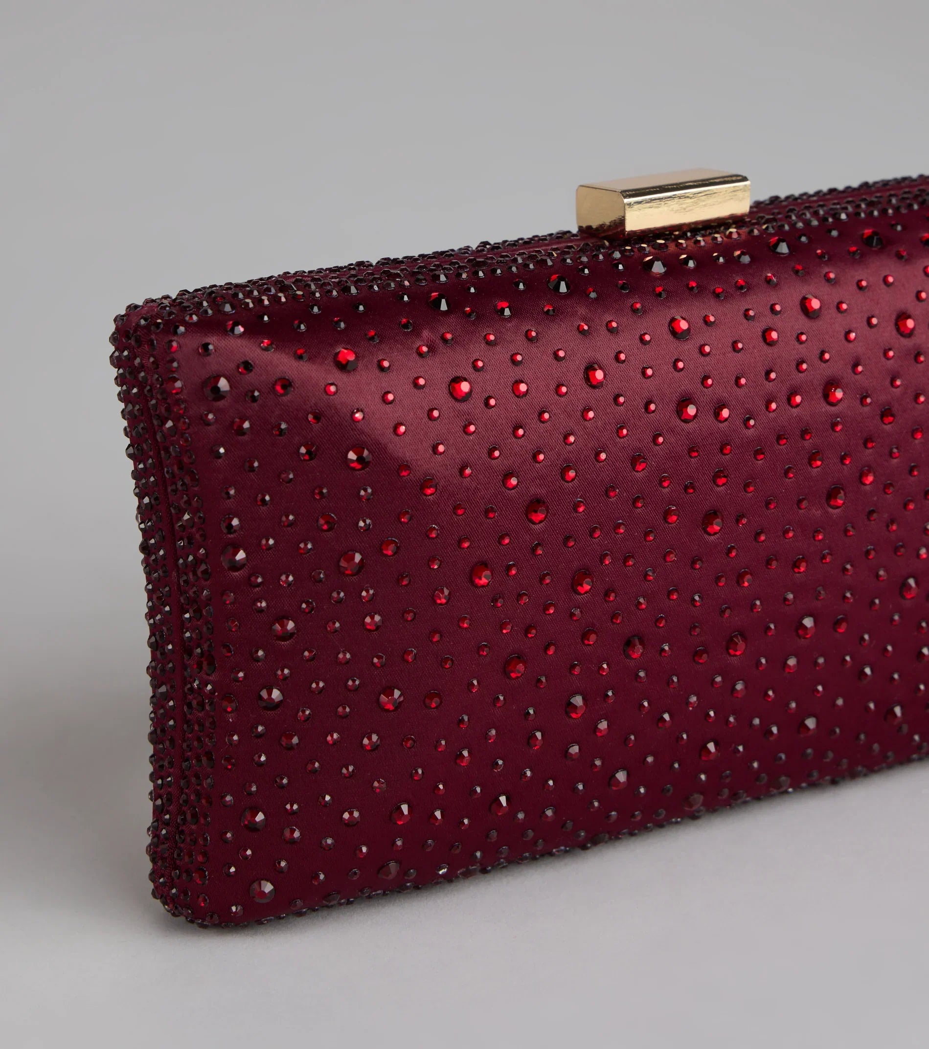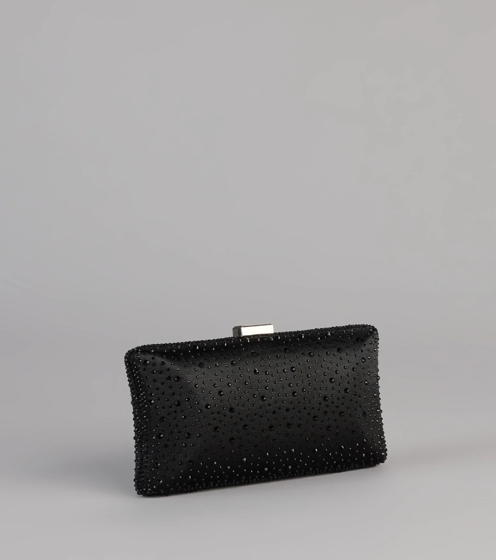 Small bag, major shine. This satin box clutch is scattered with rhinestones that catch every bit of light—perfect for weddings, parties, or any formal plans that call for extra sparkle.