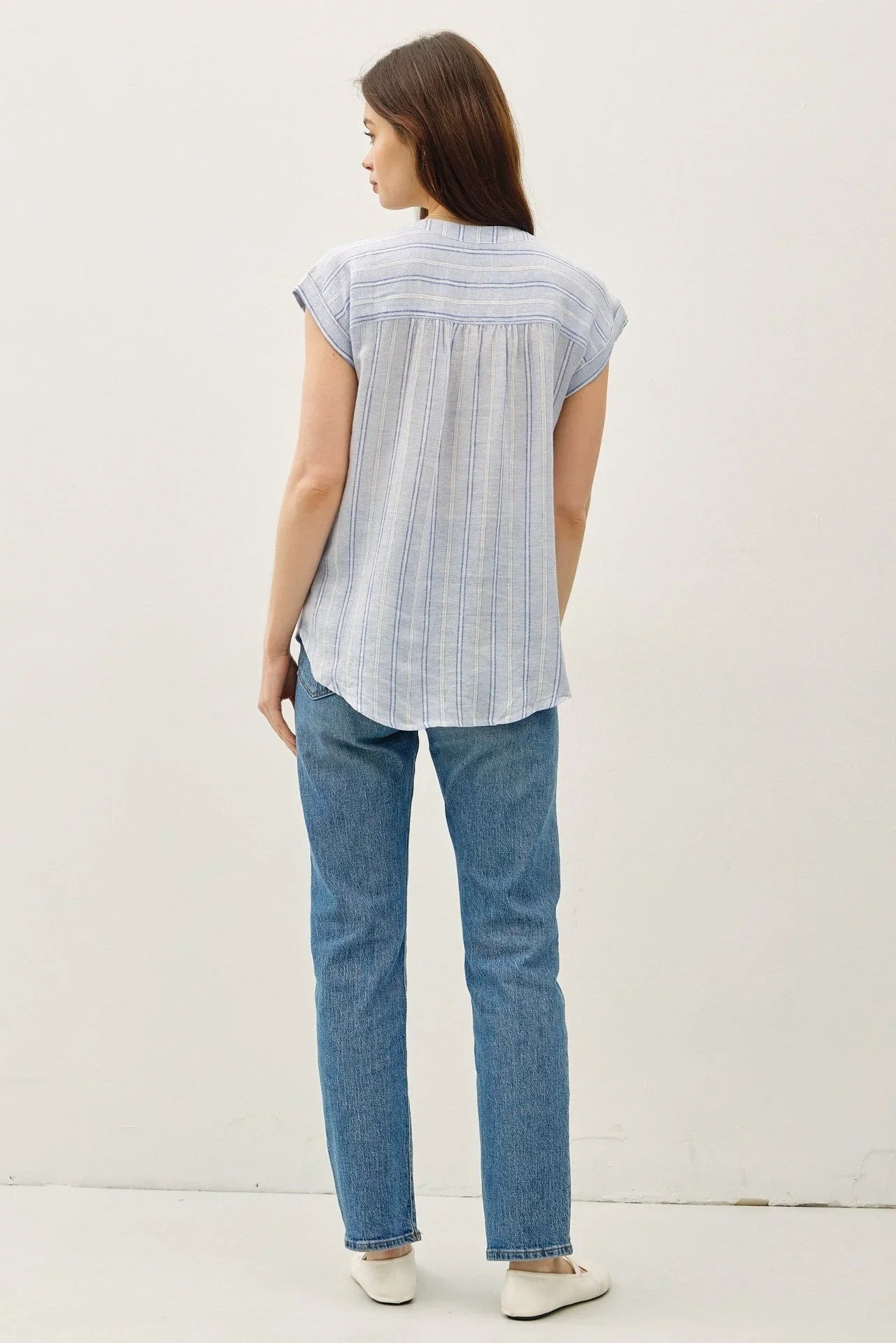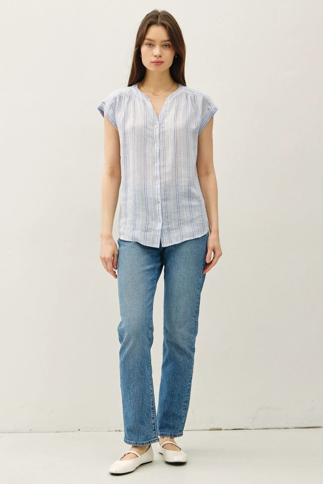 Featuring a chic striped print and a flattering mandarin collar, this versatile piece is ideal for casual outings or relaxed office wear. The capped short sleeves and high-low round hem add a touch of modern sophistication, while its breathable design ensures you stay fresh in warmer weather.