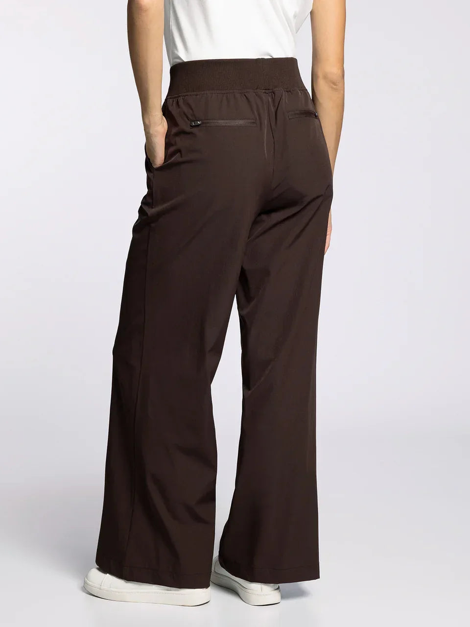 Featuring a wide-leg fit and an elastic pull-on waistband, these pants ensure a flattering silhouette with ease of wear. Dual side pockets with a secret stash zip add practicality and functionality, keeping your essentials secure while on the go.