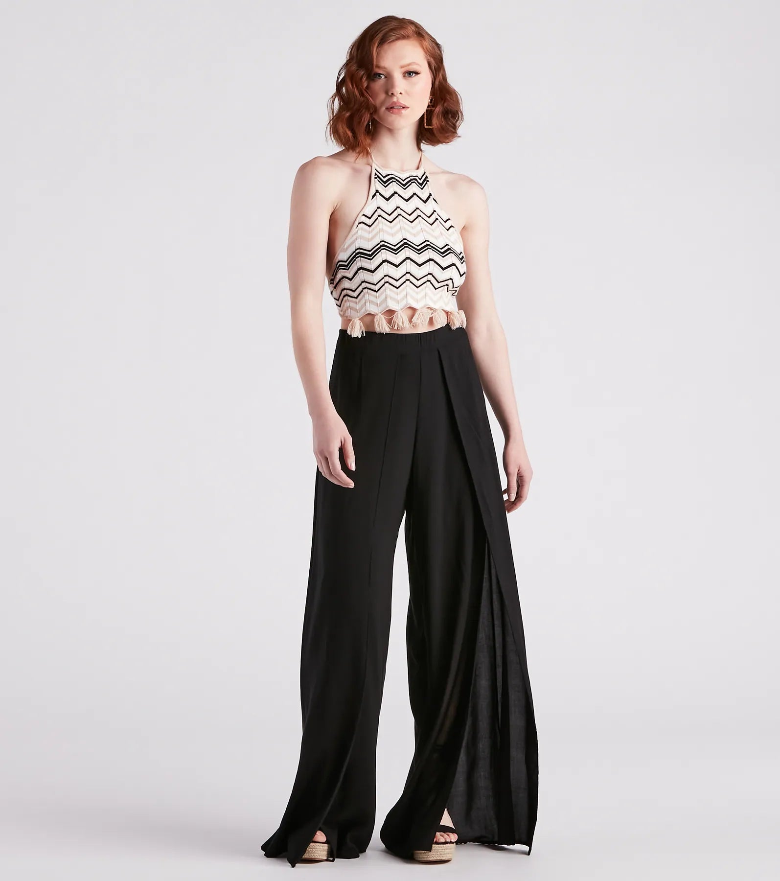 Let the sun kiss your shoulders in this sweater knit top for festivals, concerts, or any weekend plans! It features a sleeveless halter neckline with a tassel tie-neck closure, a fitted crop hem with tassel trim, and a sultry open-back with a tassel tie-back closure. The top is designed with a multi-colored chevron knit fabric with minimal stretch. Complete the look in flare denim jeans.